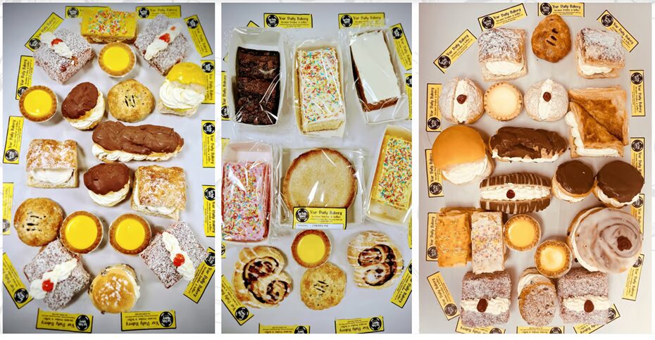 | Variety | Apple Turnovers x 2, Brownies x 2, Carrot Cake Slice, Cherry Sundae's x 2, Chocolate Cream Doughnuts x 2, Chocolate Eclairs x 2, Creamed Belgian Buns x 2, Creamed Teacakes x 2, Custard Eclairs x 2, Custard Slices x 2, Devonshire Splits x 2, Doughnuts Jam x 4, Fruit & Cream Scones x 2, Iced Cake Chocolate, Iced Cake Fancy, Iced Cake Strawberry, Jam & Coconut Madeleines x 2, Jam & Cream Doughnuts x 2, Jam & Cream Puff Pastries x 2, Jam & Cream Scones x 2, Lemon Cream Buns x2, Pineapple Tarts x 2, Vanilla Slices x 2 |